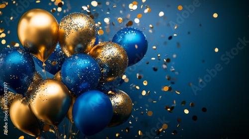 Colorful party balloons with confetti on a blue background celebrating a special occasion