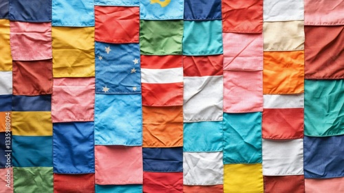 Colorful patchwork fabric, vibrant textiles arranged in a mosaic pattern, perfect for design projects or crafting inspiration.