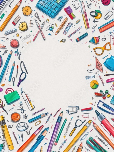 Colorful patterned background filled with school supplies creating a vibrant border, leaving a central space for a heading or message