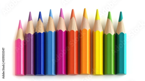 Colorful pencils arranged in a row on a white background. Possible use educational or art supplies catalog