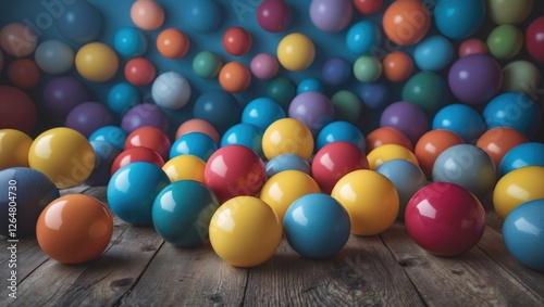 Colorful plastic balls scattered on wooden floor with a vibrant background of balloons in various colors and Copy Space available.