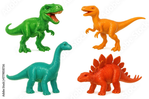 Colorful plastic dinosaur toy set featuring t-rex, stegosaurus, brachiosaurus, and velociraptor characters on transparent background