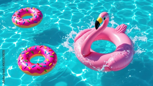 Colorful pool floats in clear water create a fun summer vibe.