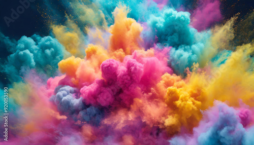Colorful powder clouds explosion full screen abstract art close-up. Multicolor, fuchsia pink, yellow, blue, turquoise dust blowing up. Energetic expansion, burst rainbow colors on black background.