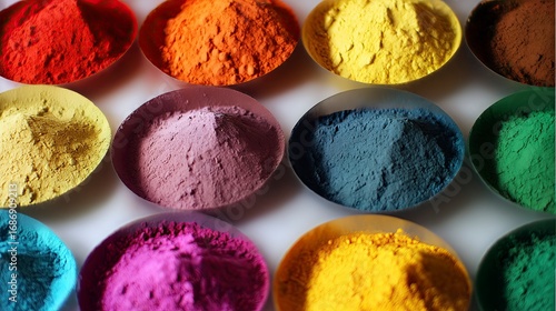 Colorful powder pigments in bowls, creative background