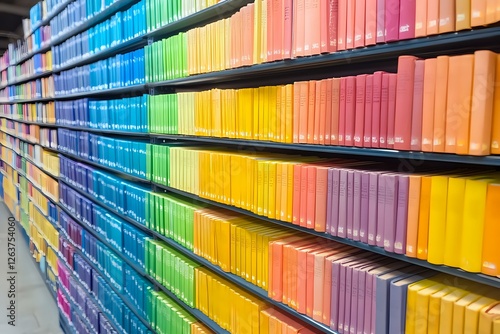 Colorful rainbow spectrum of books arranged on library shelves creating vibrant gradient pattern, modern bookstore interior with organized literature collection.