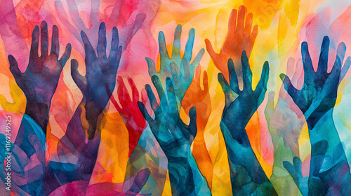Colorful Raised Hands with Vibrant Overlapping Silhouettes and Translucent Watercolor Effect