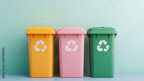 Colorful recycling bins in yellow, pink, and green against a light blue background, promoting eco-friendly waste management and sustainability.