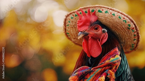 Colorful rooster wearing a traditional Mexican sombrero with green decorations, wrapped in vibrant serape blanket against warm bokeh background