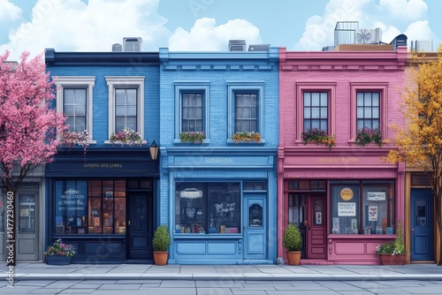 Colorful row of boutique shops showcases vibrant storefronts in a quaint neighborhood during a sunny day