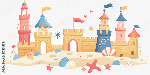 Colorful Sandcastle Illustration on Beach with Seashells and Starfish