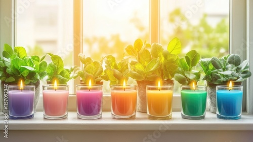 Colorful scented candles and fresh greenhouse plants on sunny windowsill. Global Family Day
