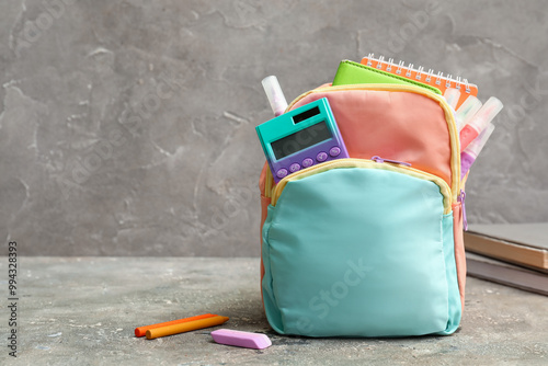 Colorful school backpack with notebooks, calculator and markers on grey grunge table near wall