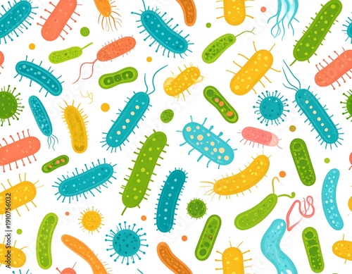 Colorful seamless vector pattern of bacteria and microorganisms on a white background