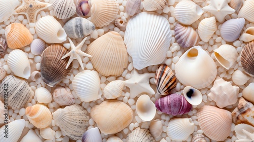 Colorful seashells on sandy beach surface.