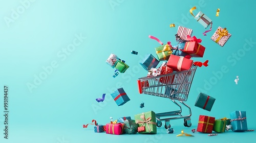 Colorful Shopping Bags and Cart on Minimalist Blue Background for Online Retail and E-commerce