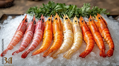 Colorful shrimp on ice, restaurant display, fresh seafood