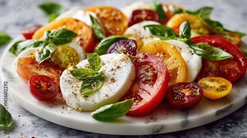 Colorful slices of fresh mozzarella and tomatoes are arranged beautifully with basil leaves. The dish showcases several tomato varieties, enhancing its visual appeal
