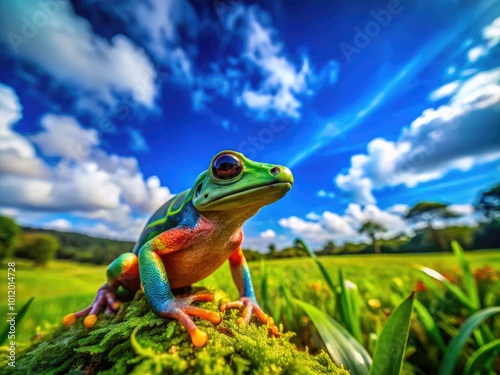 Colorful small creature standing in a vibrant green landscape with a bright blue sky backdrop