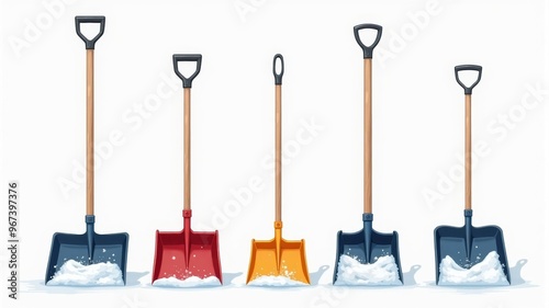Colorful Snow Shovels in Fresh Snow - Winter Tools Illustration with Blue, Red, and Yellow Shovels