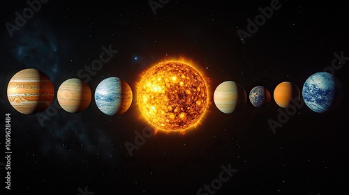Colorful solar system with realistic planetary bodies orbiting the sun, representing space exploration.