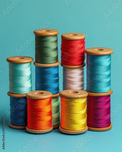 Colorful spools of thread stacked artfully against a vibrant teal background, showcasing creativity and craftsmanship.
