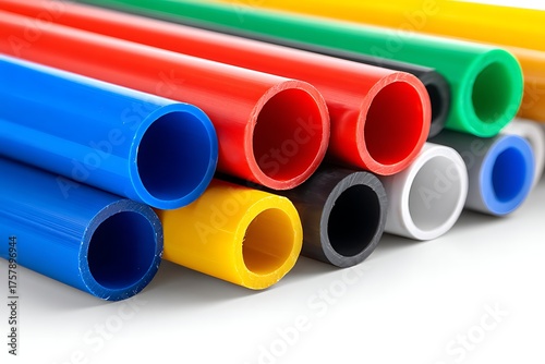 Colorful Stacked Plastic Pipes Tubes on White Surface, Industrial, Plumping, Material