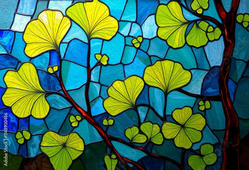 Colorful stained glass window. Botanical pattern. Multicolored interior design template. Gingko Biloba