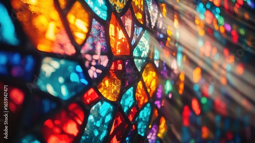 Colorful stained glass window, sunlight rays, church interior, vibrant mosaic