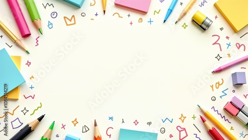 Colorful stationery collection arranged around a blank canvas for creative ideas in a bright workspace filled with playful doodles and inspiring materials