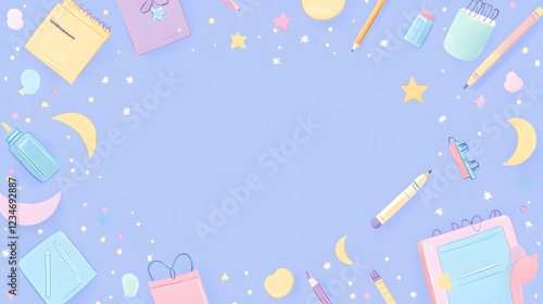 Colorful Stationery Elements on Soft Blue Background with Stars