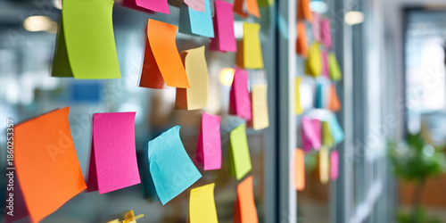 Colorful sticky notes in various shades of pink, orange, yellow, green, and blue arranged on a transparent glass wall in an office environment, creating a vibrant and organized