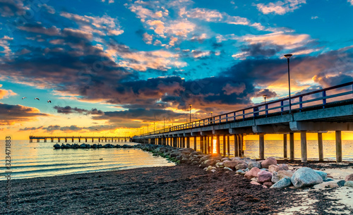 Colorful sunset at a famous marine pier in the Baltic resort city of Palanga, Lithuania, Europe