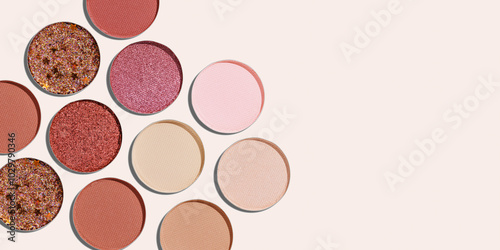 Colorful Swatches eyeshadow refills as minimal geometric pattern, banner with copy space. Matte and glitter pans with sun shadows, detail texture, cosmetic, beauty product, makeup, warm color scheme
