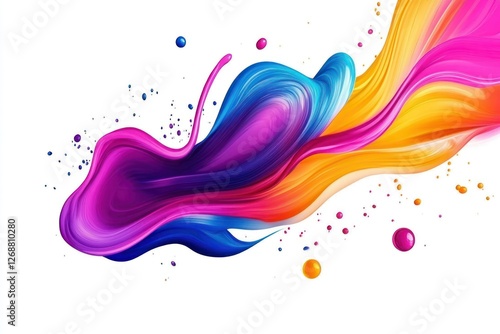 Colorful, swirling liquid explosion with curved patterns and paint drops, set on a clean white background for a modern abstract effect.
