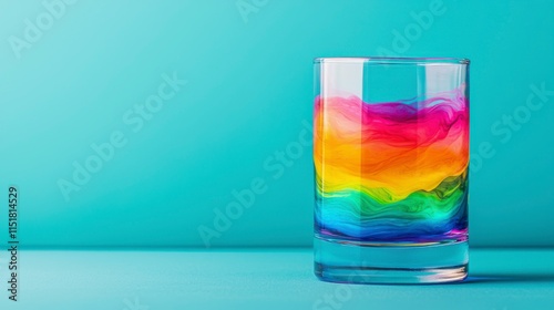 Colorful Swirling Liquids in Glass Against a Bright Turquoise Background Showcasing an Artistic Blend of Rainbow Hues for Creative Visuals and Designs