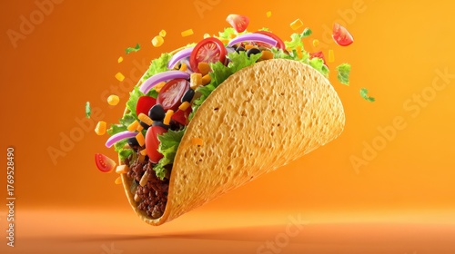 Colorful taco bursting with fresh ingredients against an orange backdrop