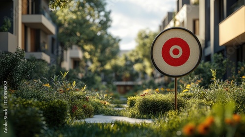 Colorful Target Sign Surrounded by Greenery in Urban Environment
