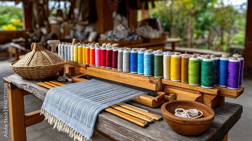 Colorful threads and wooden loom