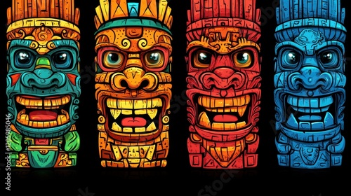Colorful Tiki Masks Illustrating Polynesian Culture and Artistry