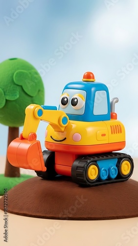 Colorful toy excavator on brown mound.