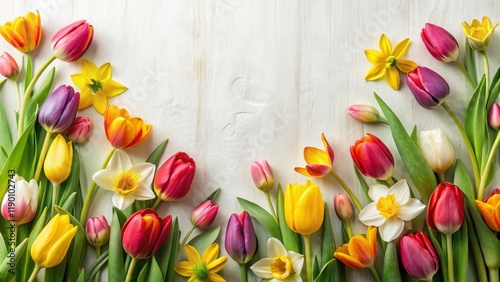 Colorful Tulips and Daffodils on a Soft White Paper Background with Delicate Vines and Green Leaves , colorful blooms, nature