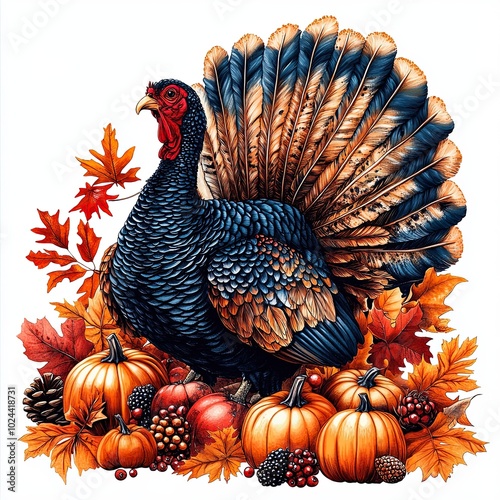 Colorful turkey surrounded by autumn leaves and pumpkins, A detailed illustration of a vibrant turkey with colorful feathers, surrounded by pumpkins, berries, and autumn leaves, symbolizing Thanksgiv