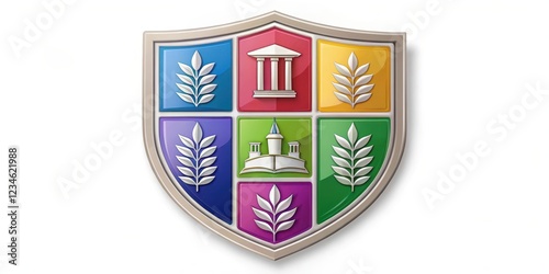 Colorful university crest icon on a white background with subtle gradient effect, academic symbols, educational institutions