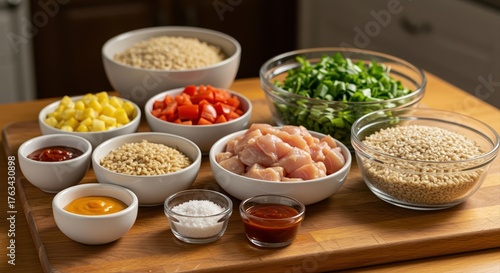colorful variety of fresh ingredients on a wooden cutting board for a healthy recipe preparation