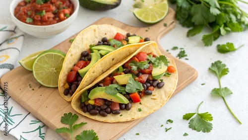 Colorful vegan taco with black beans, fresh vegetables, and lime served on a wooden board alongside salsa