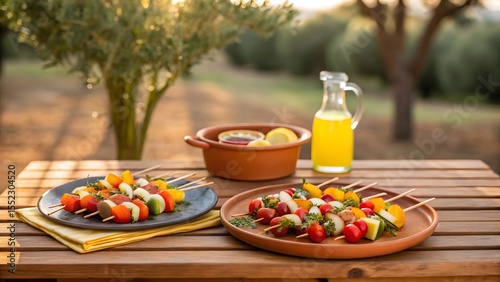 Colorful Vegetable Skewers on Rustic Table in Sunny Mediterranean Garden