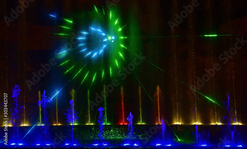 Colorful water fountains. Beautiful laser and fountain show. Large multi colored decorative dancing water jet led light fountain show at night. Dark background.