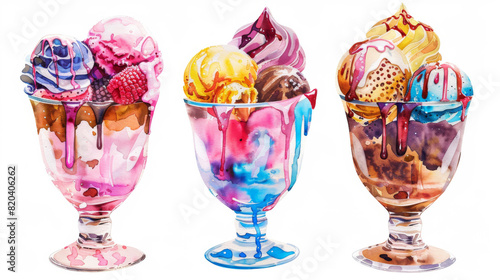 Colorful watercolor painting of a glass of ice cream sundea