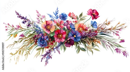 Colorful wildflower bouquet art with vibrant hues and delicate details on a clean white background for decorative purposes.